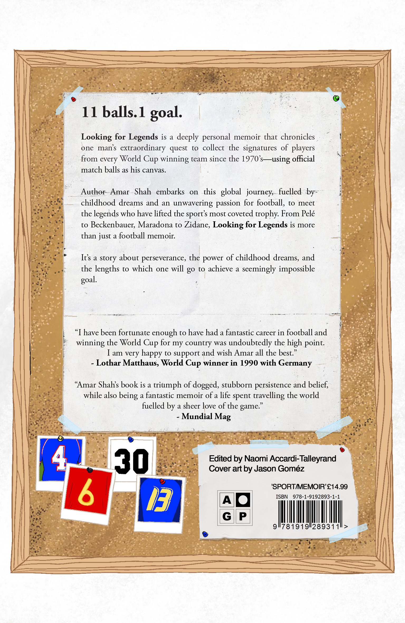 Looking for Legends is an extraordinary tale about a childhood dream that turned into a trip around the world to seek out some of the greatest footballers to have ever played the beautiful game. Amar shares his experience of attempting to track down World Cup heroes to sign his collection of World Cup matchballs from 1970-2010. Each ball tells a story that will resonate with football fans of all ages.